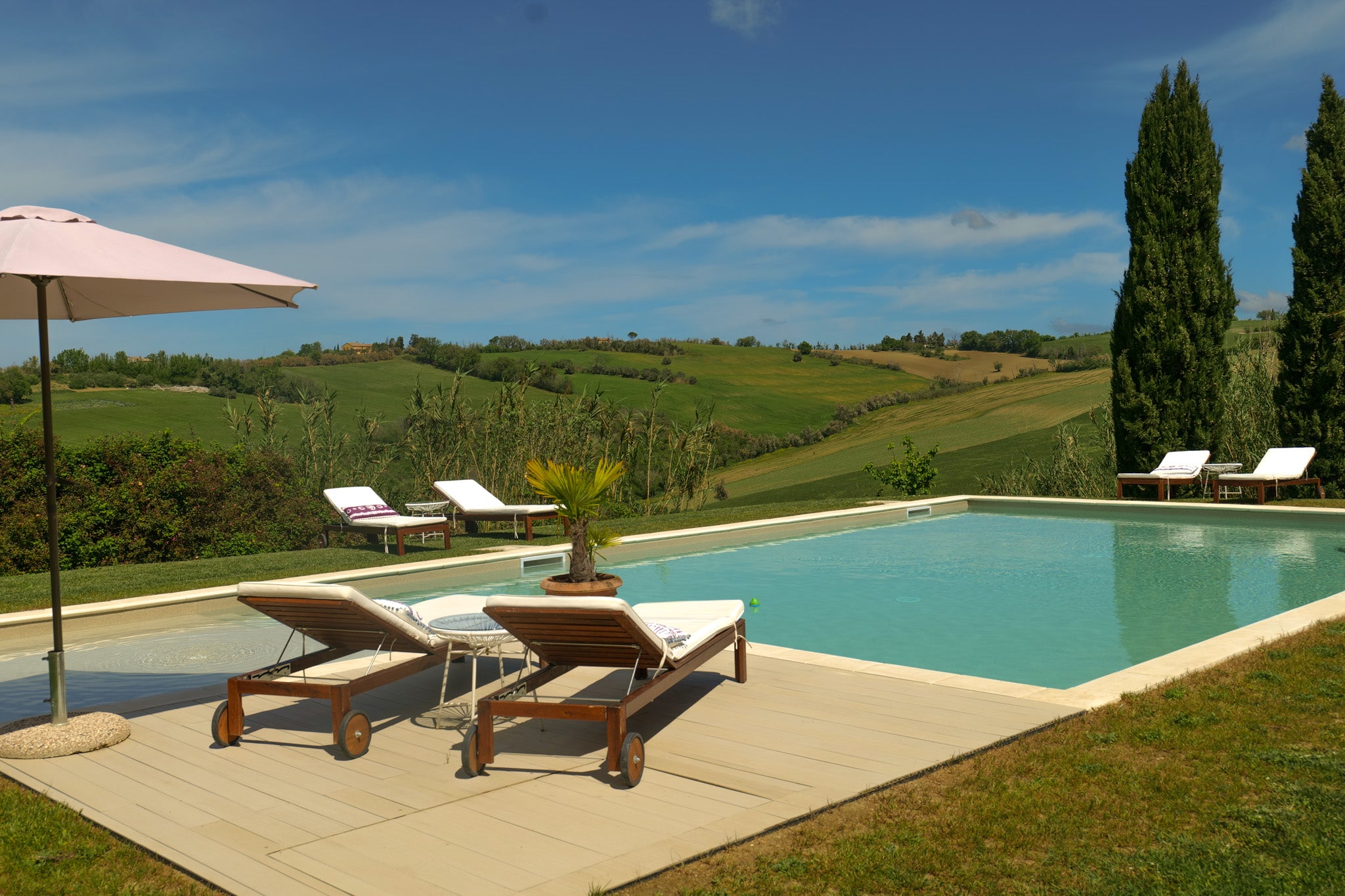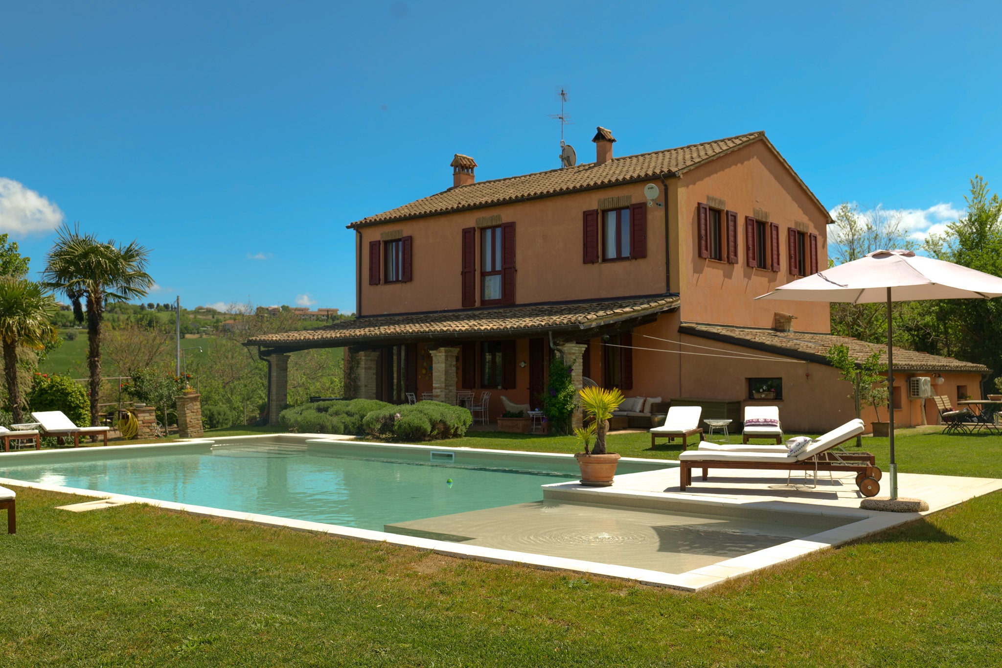 Il nostro Casale è situato in posizione idilliaca e tranquilla nelle colline marchigiane, circondato da campi di grano e girasoli.
