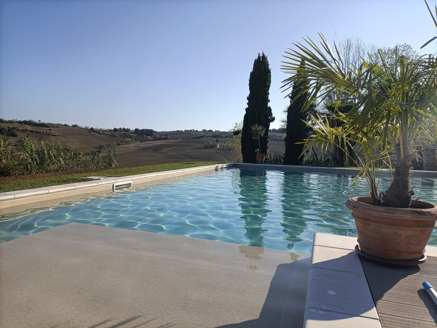 Camera matrimoniale con bagno in camera, frigorifero, aria condizionata, riscaldamento, zanzariere, tv, wifi e vista piscina